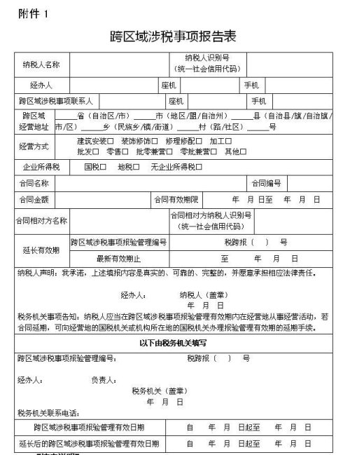 (二)納稅人跨區(qū)域經(jīng)營前不再開具相關(guān)證明,改為填報《跨區(qū)域涉稅事項報告表》。納稅人跨?。ㄗ灾螀^(qū)、直轄市和計劃單列市)臨時從事生產(chǎn)經(jīng)營活動的,不再開具《外出經(jīng)營活動稅收管理證明》,改向機構(gòu)所在地的國稅機關(guān)填報《跨區(qū)域涉稅事項報告表》(附件1)。納稅人在?。ㄗ灾螀^(qū)、直轄市和計劃單列市)內(nèi)跨縣(市)臨時從事生產(chǎn)經(jīng)營活動的,是否實施跨區(qū)域涉稅事項報驗管理由各?。ㄗ灾螀^(qū)、直轄市和計劃單列市)稅務(wù)機關(guān)自行確定。