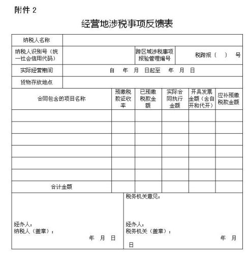 納稅人跨區(qū)域經(jīng)營活動結(jié)束后,應(yīng)當(dāng)結(jié)清經(jīng)營地的國稅機關(guān)、地稅機關(guān)的應(yīng)納稅款以及其他涉稅事項,向經(jīng)營地的國稅機關(guān)填報《經(jīng)營地涉稅事項反饋表》(附件2)。